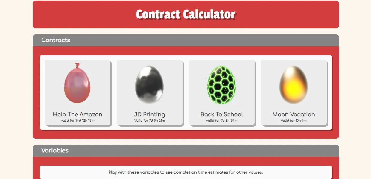 Shortly after I published my first farm value calculator for Egg, Inc., the game came out with a new feature called contracts. Contracts allowed players to join a co-operative effort to lay a certain number of eggs within a set time for rewards. When contracts were released, everyone wanted to know “will I complete this contract on time?”. So this is what this calculator aimed to solve.